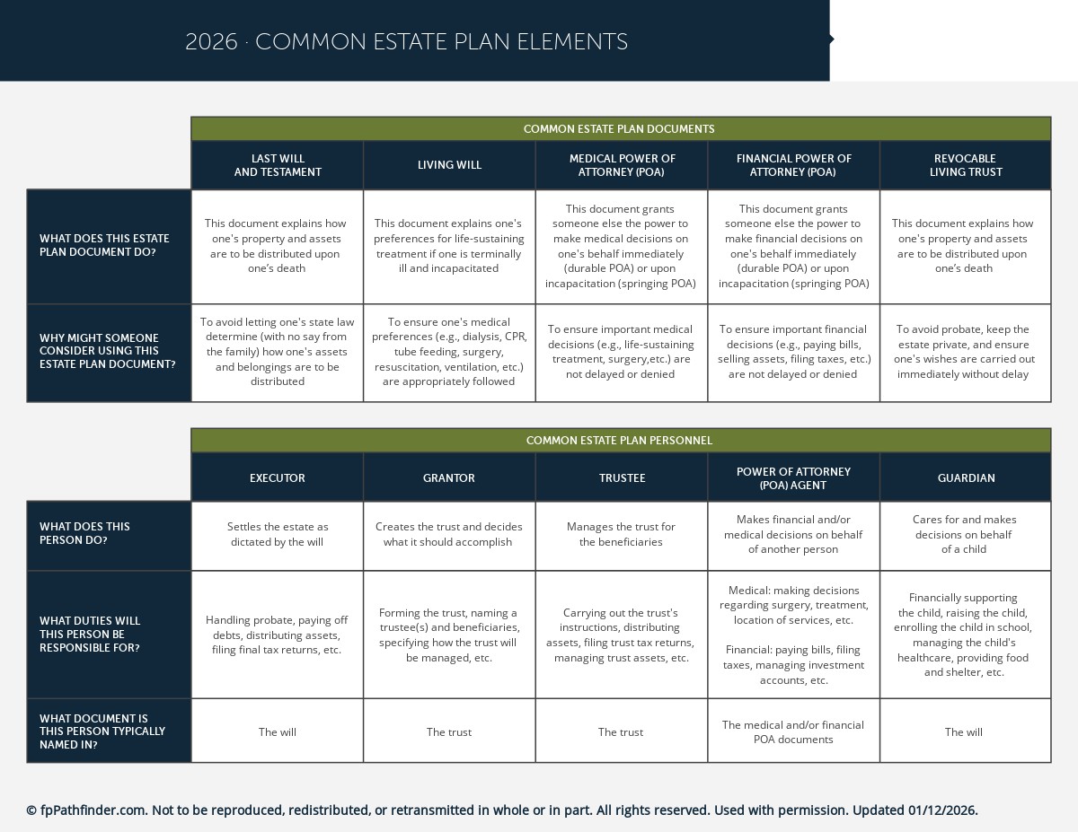 That’s where the Common Estate Plan Elements summary guide comes in. It provides a comprehensive overview of the core documents and key people involved in an estate plan. It covers:
