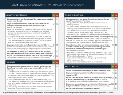 An annuity strategy merits consideration before either being dismissed or implemented. To help you navigate an annuity analysis with your clients, we have created this checklist. It covers key considerations, including: