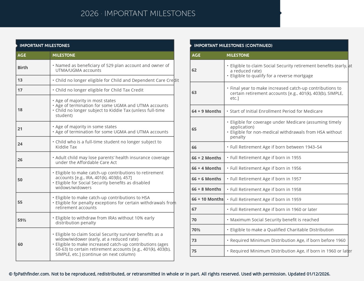 There are many important client milestones that advisors need to keep in mind. Eligibility requirements often depend on a client’s year of birth, residency, or other personal circumstances. With these variables, it can be difficult to track and recall how clients’ ages open or foreclose planning opportunities.