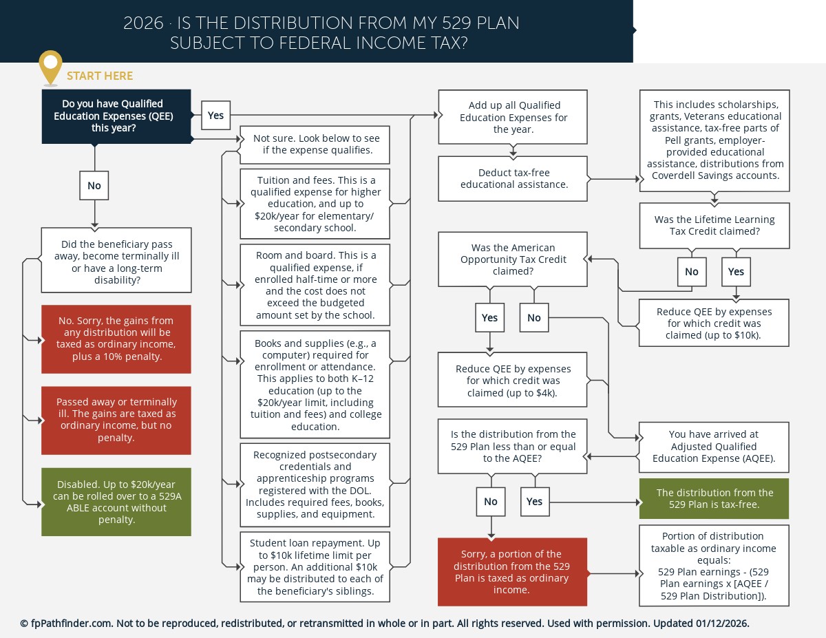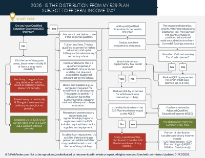 To make the discussion with clients easier, we have created the “Is The Distribution From My 529 Subject To Federal Income Tax?” flowchart. It covers some of the most common issues for clients who are planning to take a distribution from a 529 account and considers:
