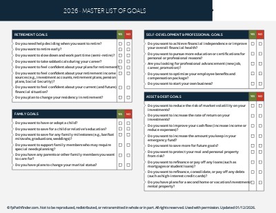In response to this challenge, we’ve created this “Master List Of Goals.” This resource is inspired by the work of Ray Sin, Ph.D.; Ryan O. Murphy, Ph.D.; and Samantha Lamas, who authored “Goals-Based Financial Planning: How Simple Lists Can Overcome Cognitive Blind Spots” in the Journal of Financial Planning.