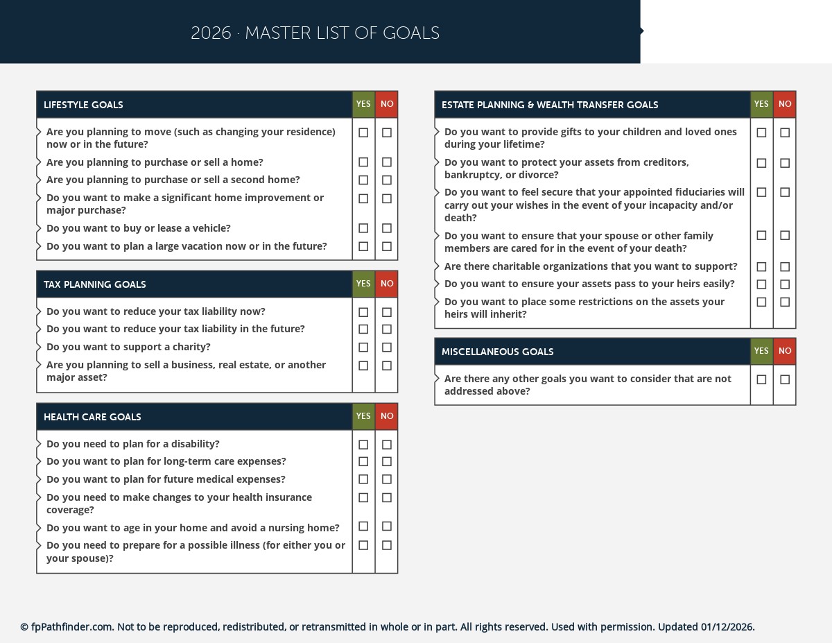 Goal setting is fundamental to sound financial planning. Whether you’re meeting with new or long-term clients, it is essential to identify and prioritize their objectives before making recommendations. Often, clients may have difficulty expressing and assigning precedence to their goals. Or, they may simply overlook a need or objective. You, as an advisor, are then tasked with the challenge of uncovering and framing clients’ goals.