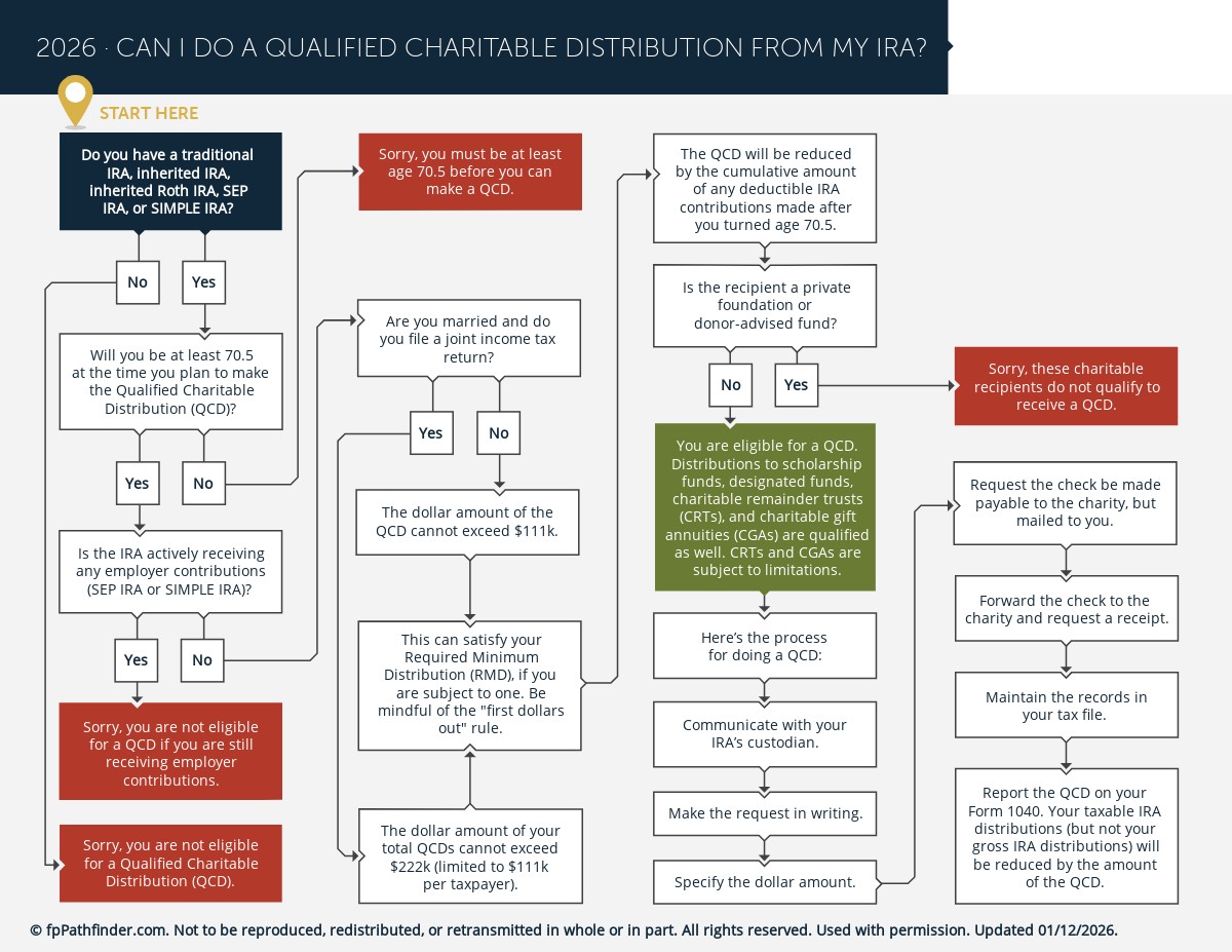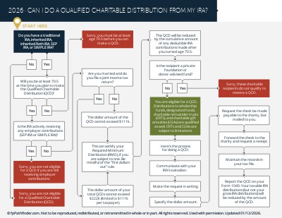 To help make the analysis easier, we have created the “Can I Do A Qualified Charitable Distribution From My IRA?” flowchart. This flowchart addresses common issues pertaining to Qualified Charitable Distribution rules, including: