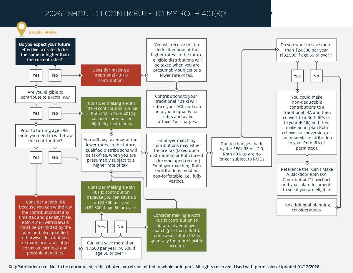 This flowchart helps you guide your clients through a series of considerations that will inform their decision whether to contribute to a Roth 401(k), and covers: