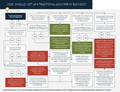 To help make this analysis easier, we have created the “Should I Set Up A Traditional 401(k) For My Business?” flowchart. It addresses some of the most common issues that arise for a client looking to set up a retirement plan for his or her business. This flowchart considers: