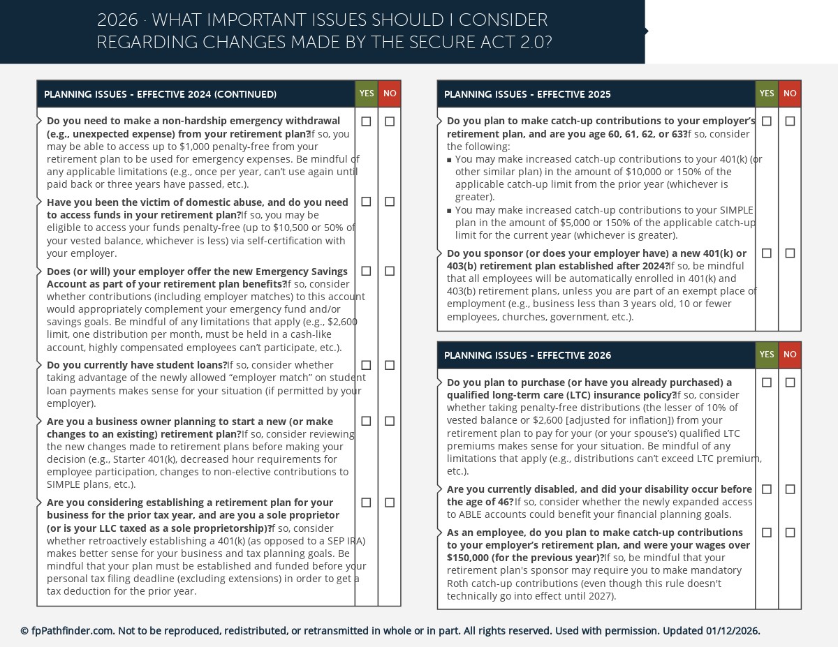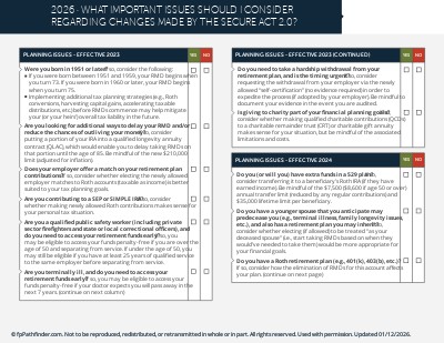 Using this checklist, you will be able to effectively highlight the important changes that affect your client, identify some proactive planning points to consider, and be able to chronologically prioritize which next steps should be taken. This checklist covers many important issues to consider as a result of the SECURE Act 2.0, such as:
