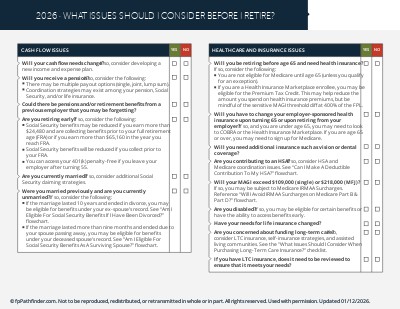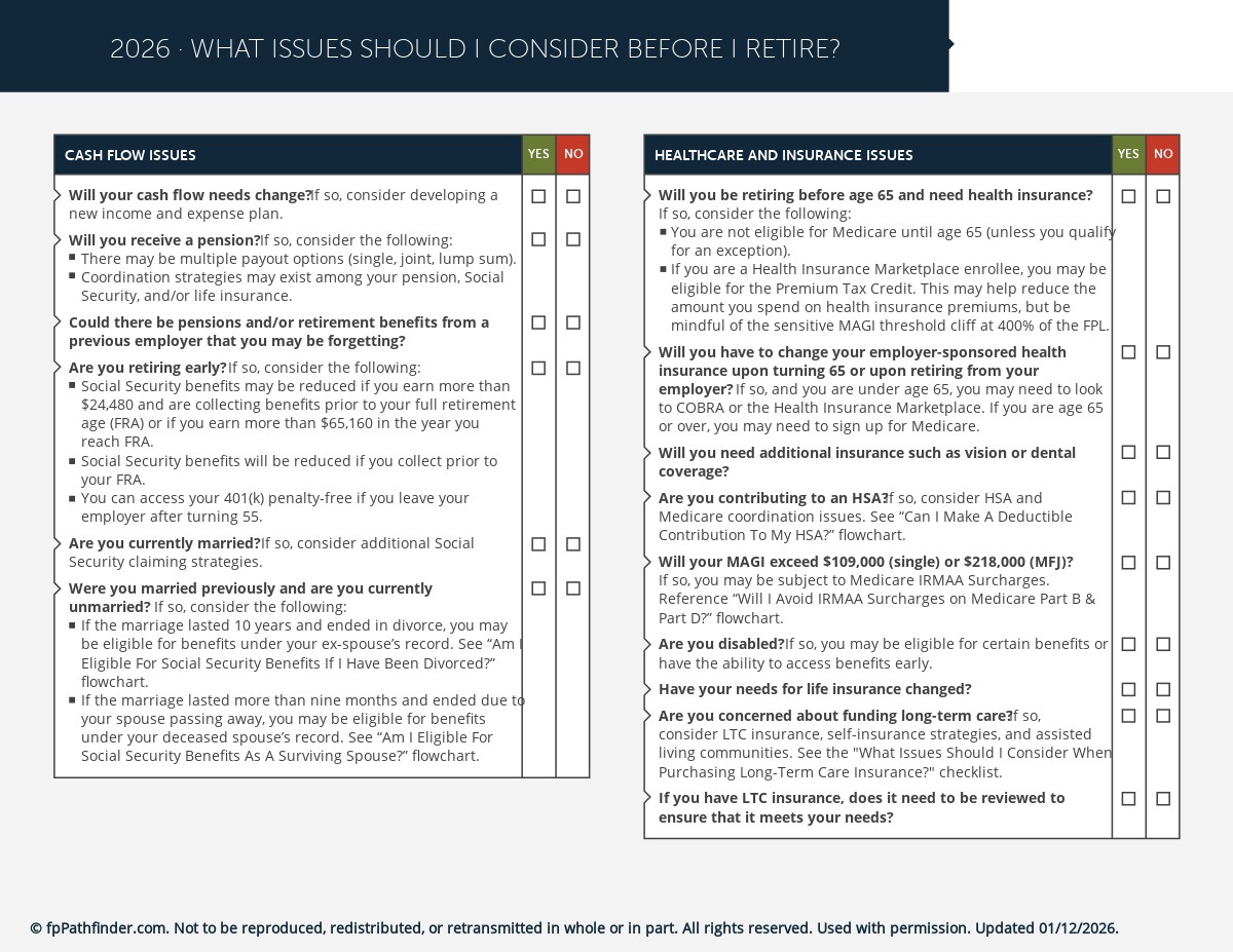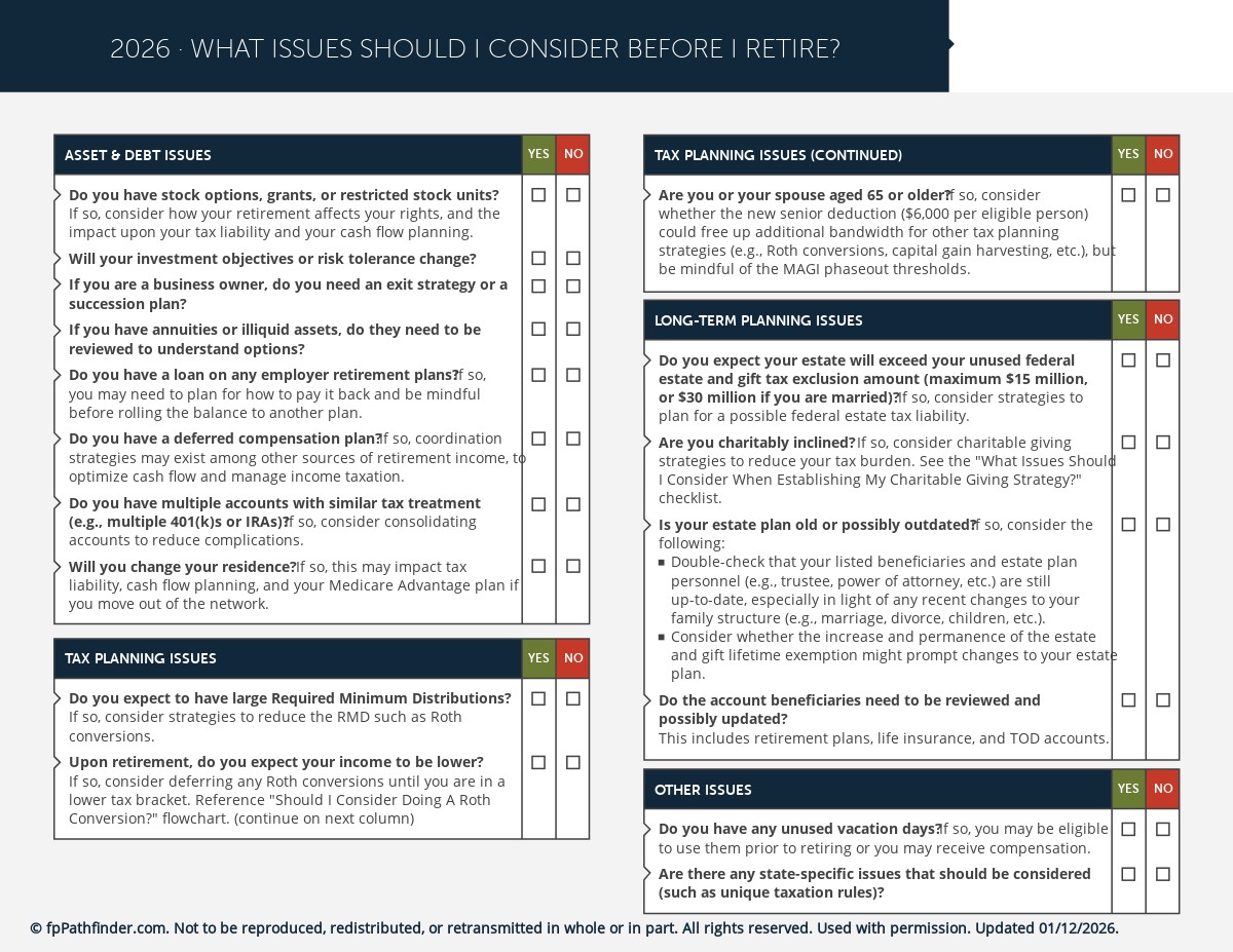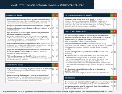 This checklist covers 32 of the most important planning issues to identify and consider for a client who is about to retire. It’s structured as follows: