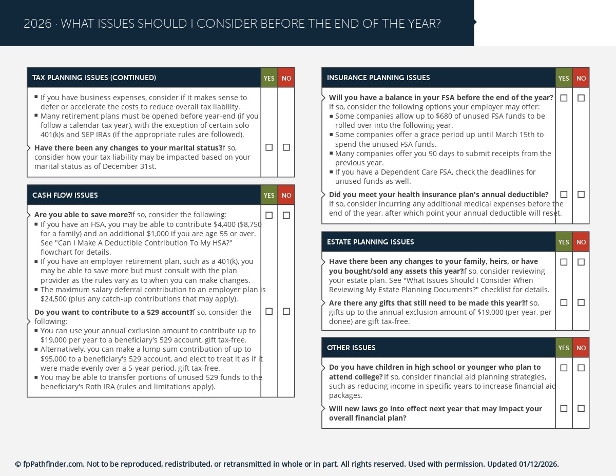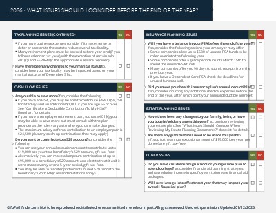 The end of the year provides a number of planning opportunities and issues for financial advisors to discuss with their clients. Year-end topics can include tax planning, investment and retirement accounts, charitable giving, cash flow and savings, insurance and estate planning.