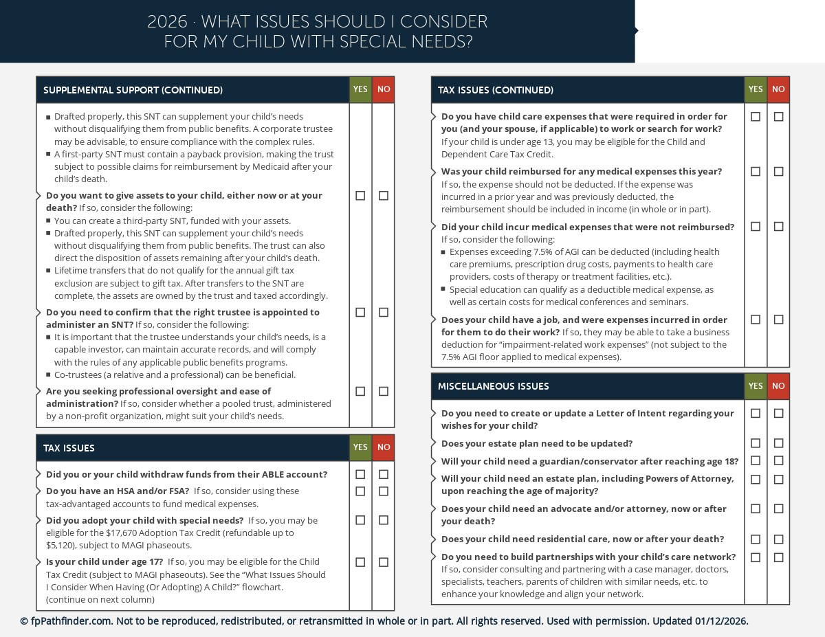 Clients who have children with special needs must deal with a unique set of planning issues. In addition to health, educational, and care planning issues, special needs present complex financial issues for families to address. These planning conversations are as important as they are difficult, and they require a direct but delicate approach. This checklist can be especially helpful for advisors who are not experts in respect to individuals who have special needs.
