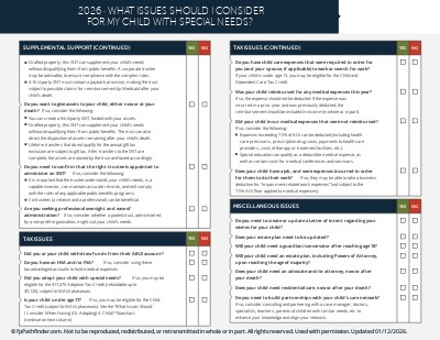 To help guide your conversations with clients about special needs planning issues, we have created this checklist. It covers key considerations, including: