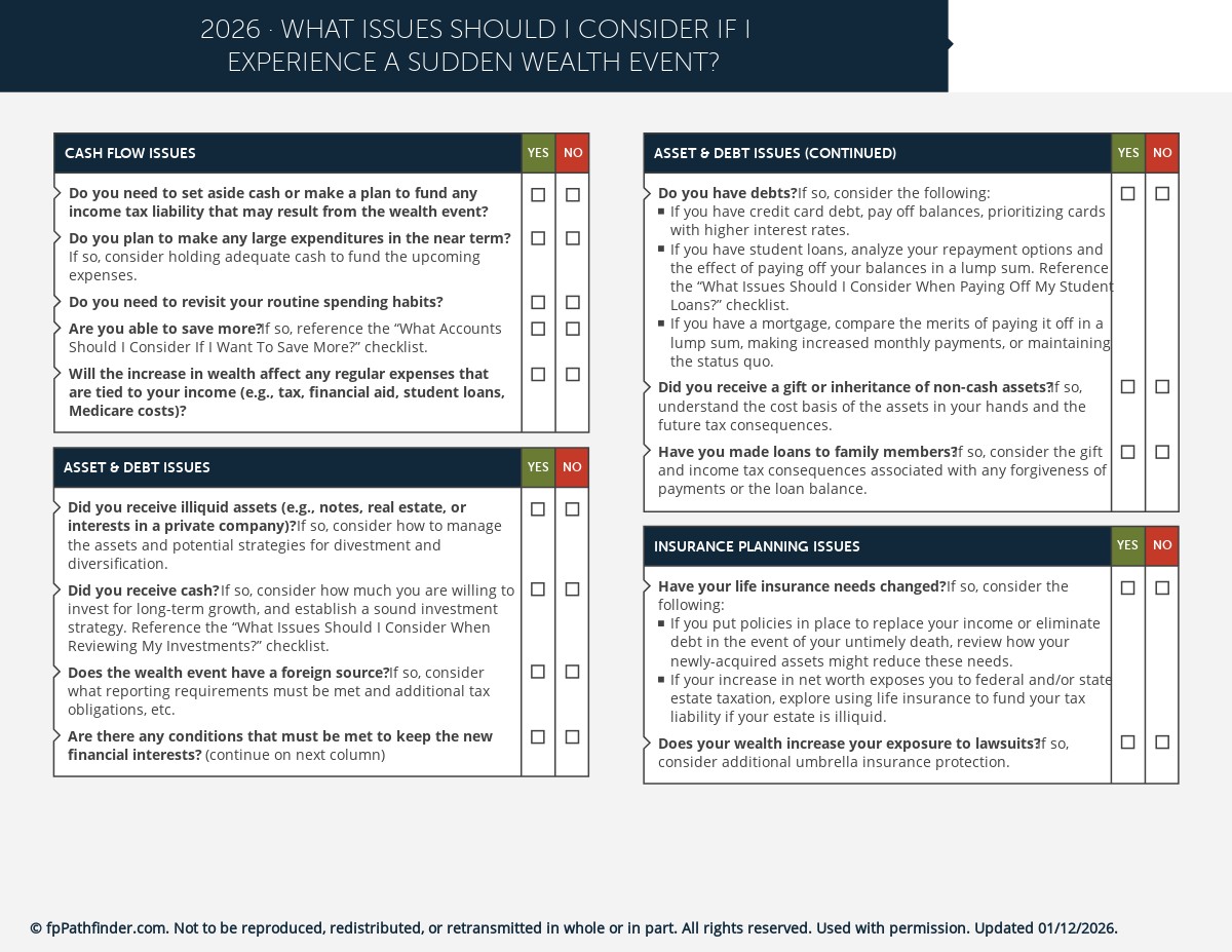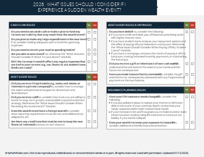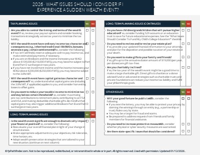 This checklist helps guide your conversations when advising clients that experience a sudden wealth event, and covers: