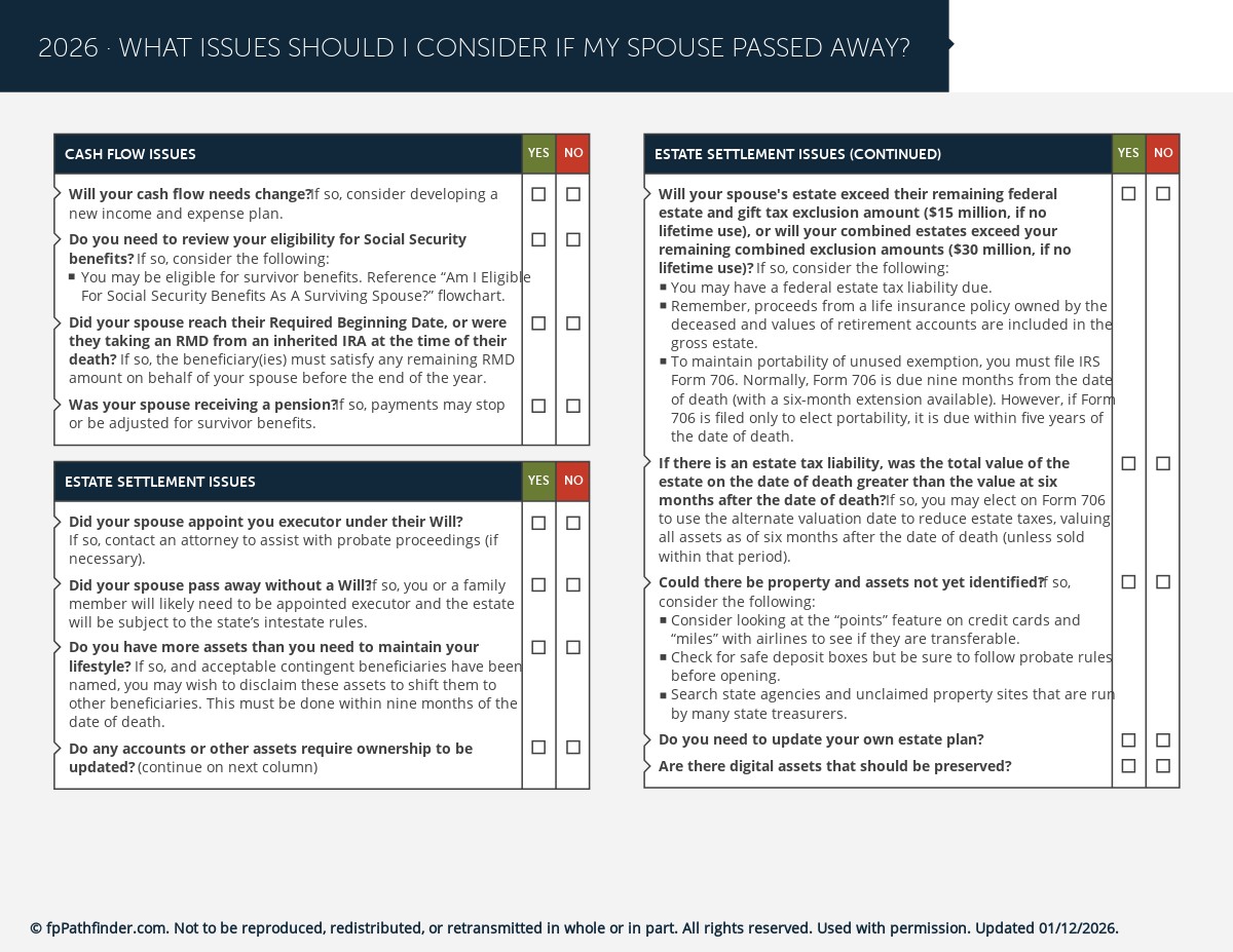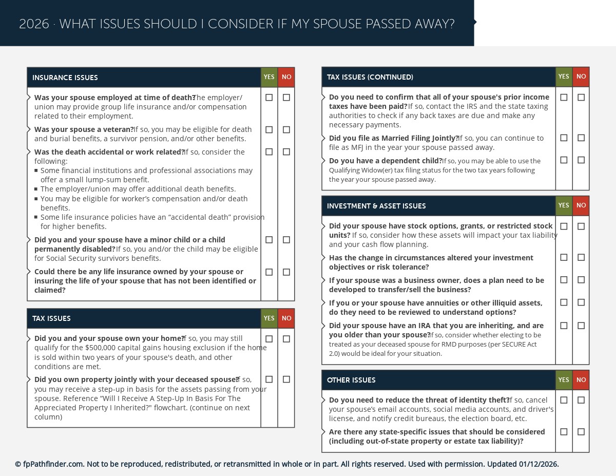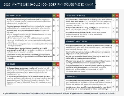 This checklist covers 29 of the most important planning issues to identify and consider for a client whose spouse has recently passed away.  It’s structured as follows:
