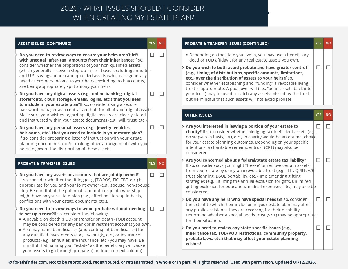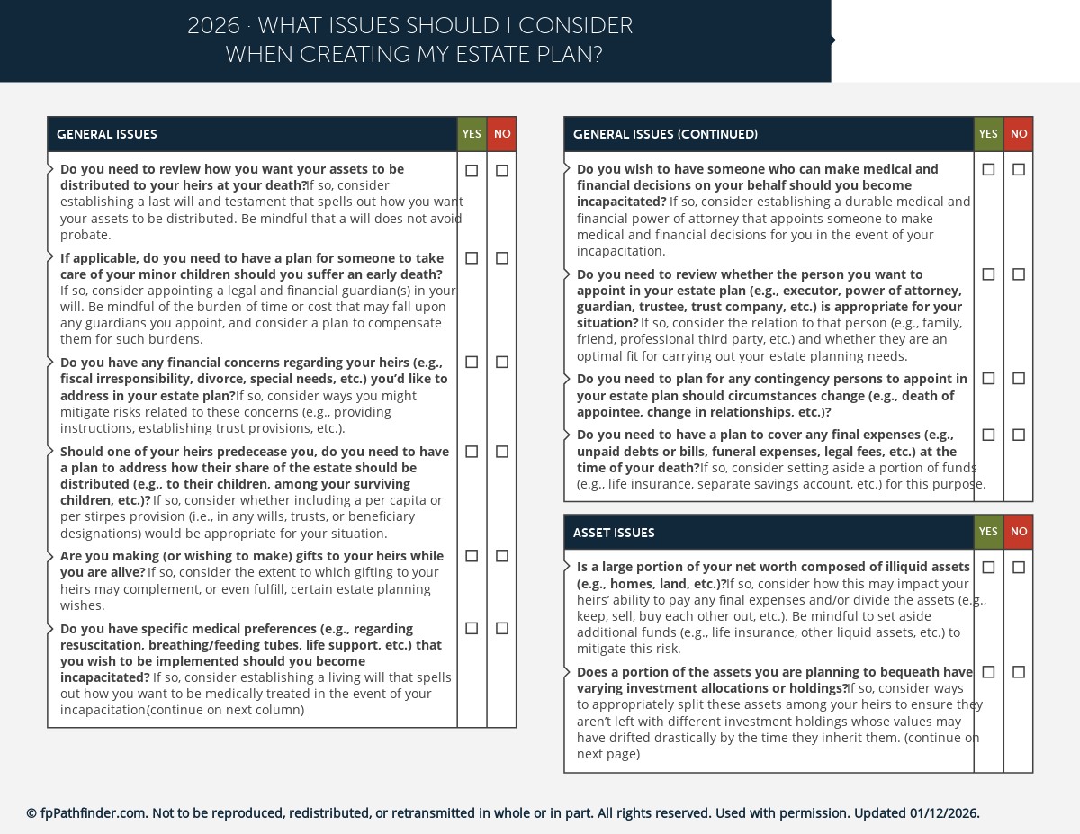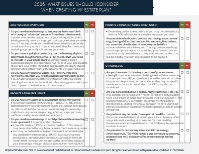 This checklist covers the key issues to consider when a client is developing their estate plan, such as: