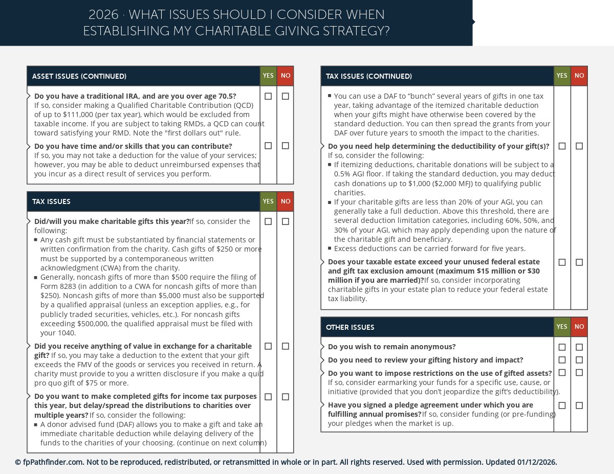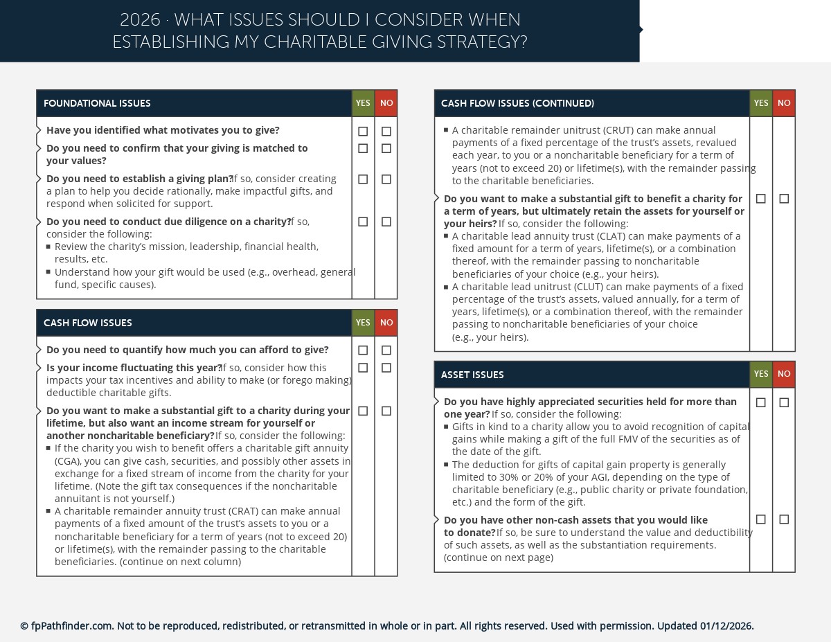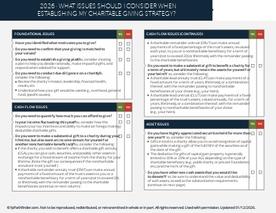 This checklist helps you guide your clients as they consider and implement a charitable giving strategy. It covers:
