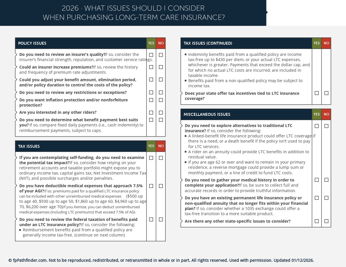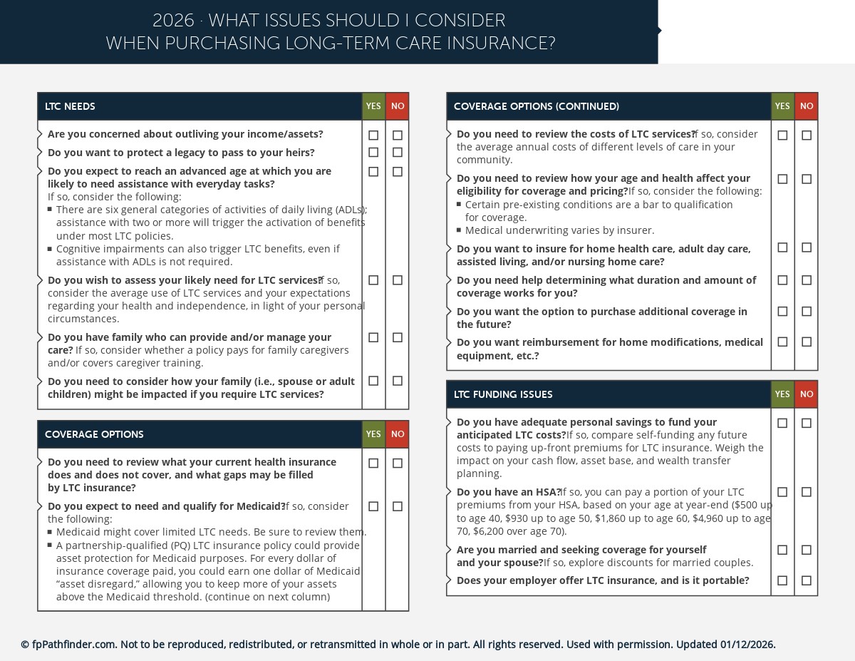 To help you guide your clients through this dilemma, we have created this checklist. It covers key issues to consider prior to purchasing LTC coverage, including: