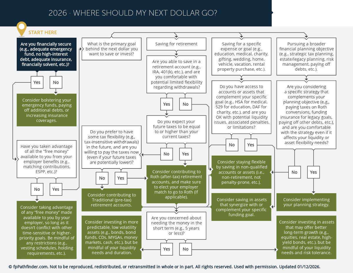 This flowchart will help facilitate a more meaningful conversation between you and your client about their unique goals and preferences, and how those goals and preferences should be factored in when developing their personal “financial order of operations.”