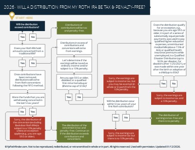 To help make this easier, we have created the “Will A Distribution From My Roth IRA Be Tax & Penalty-Free?” flowchart. This flowchart helps to quickly identify circumstances that could have an impact on how a distribution is taxed (and penalized). It considers the following: