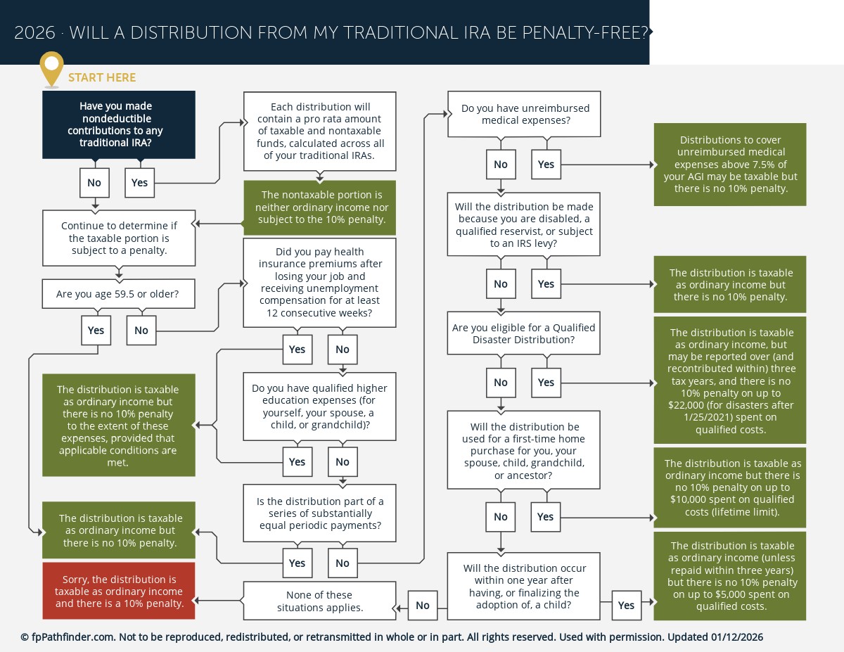 To help make this easier, we have created the “Will A Distribution From My Traditional IRA Be Penalty-Free?” flowchart. This flowchart helps to quickly identify unique situations that affect whether a distribution is taxed and penalized, and considers the following: