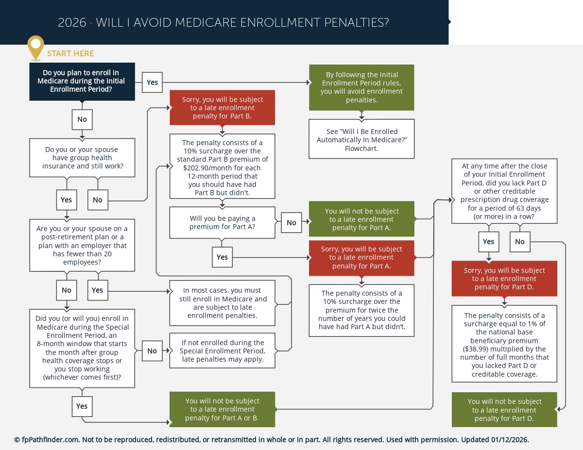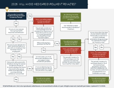 To help make this analysis easier, we have created the “Will I Avoid Medicare Enrollment Penalties?” flowchart. It addresses some of the most common issues that clients face, including: