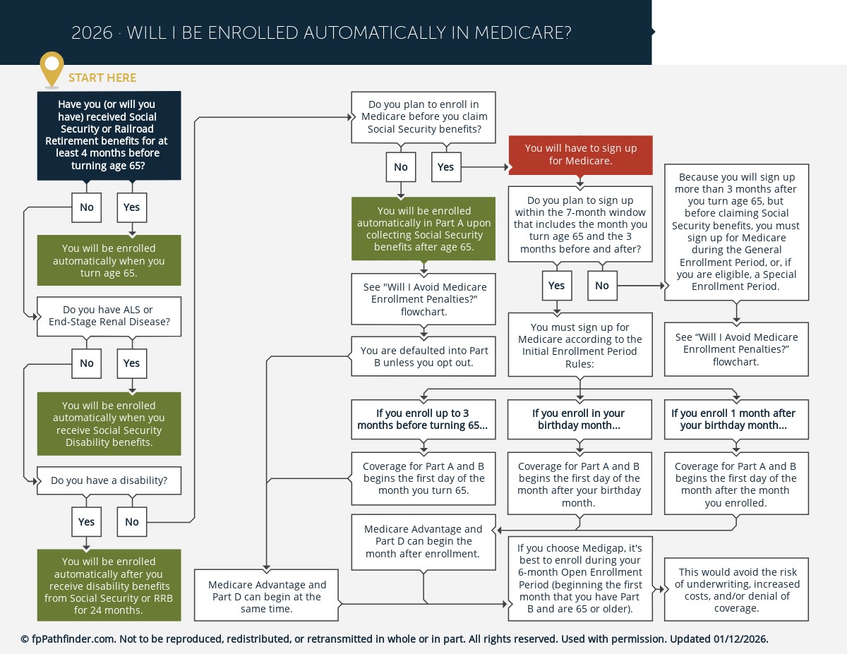 To help make this analysis easier, we have created the “Will I Be Enrolled Automatically In Medicare” flowchart. It addresses some of the most common Medicare issues that arise when a client turns 65, including: